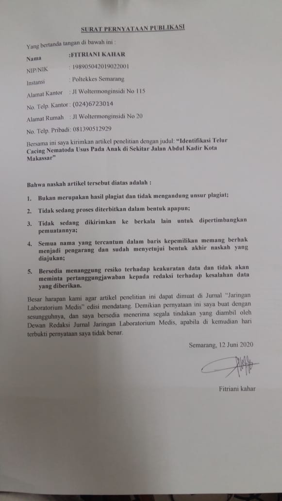 3. Fitriani Kahar. (2018). Analisis Hubungan Higiene Perorangan dengan Kejadian Kecacingan Siswa Siswi SDN Barombong Kota Makassar. UNM Environmental Journals Volume 2 Nomor 1 Desember 2018. Hal. 12 – 17